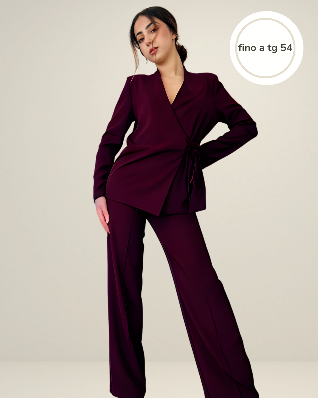 DESCRIZIONE:  Il completo Curvy che unisce eleganza e comfort con un tocco di freschezza. La giacca annodata al lato esalta la figura femminile con il suo design originale e chic, mentre i pantaloni palazzo in crepe, con il loro taglio ampio e fluido, offrono una vestibilità comoda e raffinata. La tonalità calda e sofisticata dona un aspetto moderno e primaverile, perfetto per ogni occasione, dal lavoro a una serata speciale. Un set che unisce classe, praticità e uno stile fresco per la stagione. La modella indossa una taglia 42.