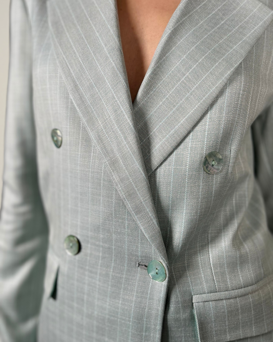 DESCRIZIONE: Questo tailleur presenta un design elegante e sofisticato. Composto da una giacca doppiopetto leggermente oversize con rever classico e due file di bottoni. La giacca ha una vestibilità strutturata ma fluida. Il pantalone ha una linea ampia e dritta, cadendo morbido fino alle caviglie per un effetto slanciato e moderno. Il tessuto è a righe sottili, in una tonalità pastello di verde salvia, che conferisce al completo un'aria fresca e contemporanea. Ideale per occasioni formali o per un look sofisticato da ufficio con un tocco di originalità. La modella indossa una taglia 42.