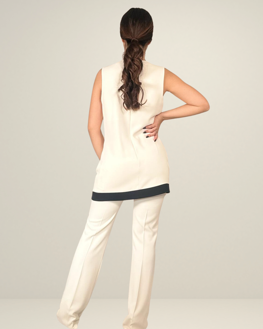 DESCRIZIONE: Pantalone color panna, coordinato con la blusa, presenta un taglio ampio e fluido. Il tessuto leggero cade morbido lungo le gambe, creando un effetto elegante e sofisticato. Vestibilità dritta e scivolata, senza dettagli visibili come tasche o decorazioni, contribuendo a un look minimalista e raffinato. La modella indossa una taglia S.