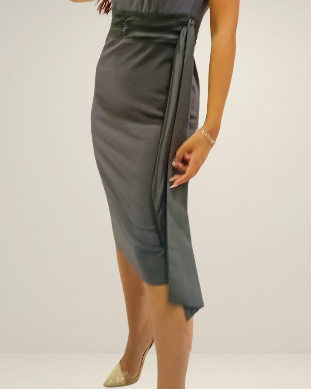 DESCRIZIONE: Abito elegante e moderno presenta una silhouette aderente che esalta la figura femminile. Realizzato in tessuto morbido e fluido, è arricchito da un drappeggio laterale che dona movimento al look. Le linee pulite rendono questo abito perfetto per le occasioni formali, ma anche per eventi più casual in cui si desidera un tocco di raffinatezza. La lunghezza midi e il design versatile lo rendono facilmente abbinabile a tacchi alti, per un look sempre impeccabile . La modella indossa una tg S.