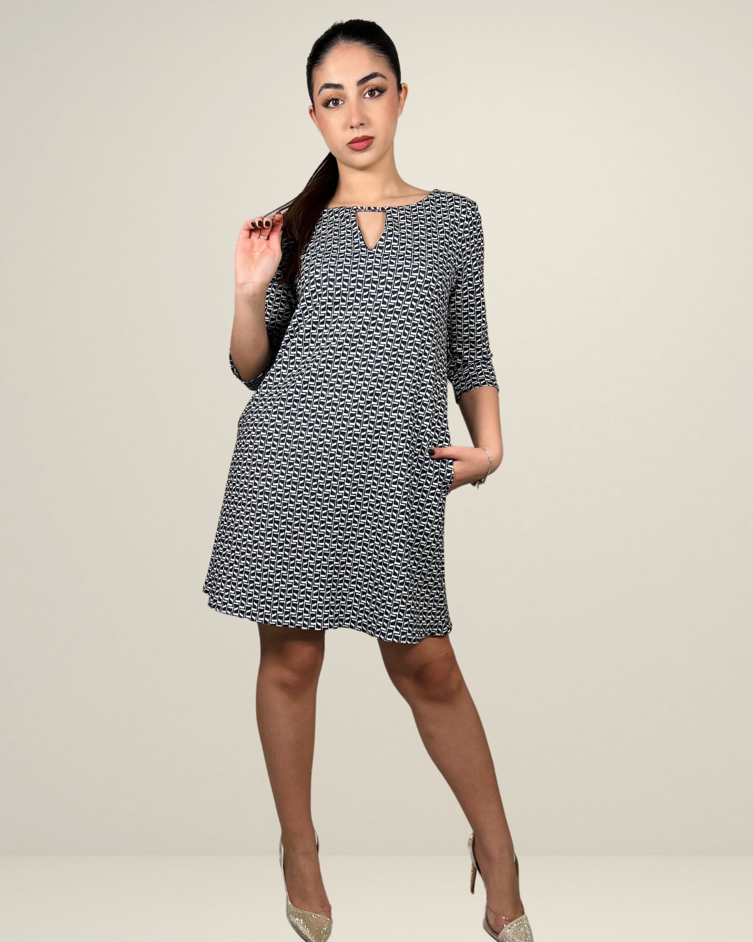 DESCRIZIONE: Abito trapezio, con maniche a tre quarti, caratterizzato da un raffinato motivo geometrico. Il tessuto leggero e fluido garantisce un'ottima vestibilità e movimento, rendendolo perfetto per diverse occasioni, sia casual che formali. Il dettaglio del piccolo scollo a goccia aggiunge un tocco di femminilità, mentre la linea svasata dona confort ed eleganza. Le tasche laterali offrono un elemento di praticità. La modella indossa una taglia S.