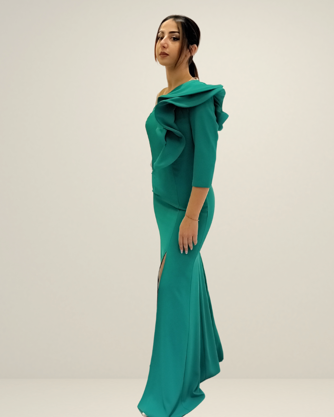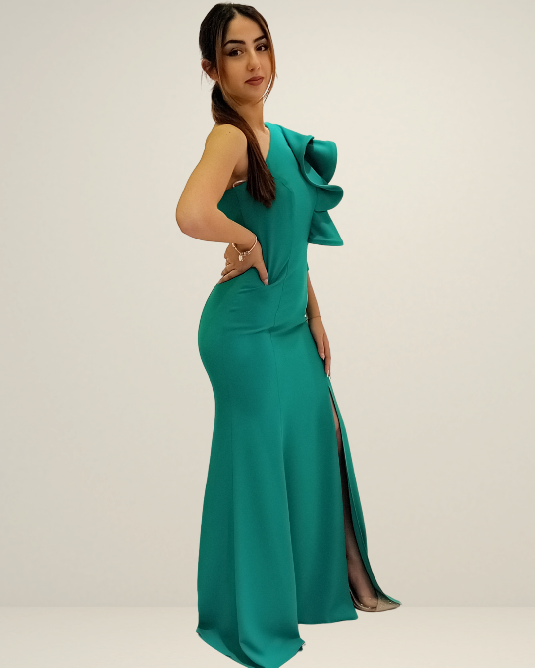 DESCRIZIONE: Questo abito lungo verde smeraldo è un'interpretazione moderna e audace dell'eleganza. Il design con una spalla unica e un dettaglio di ruches sul lato crea un look dinamico e raffinato, perfetto per chi vuole distinguersi. La silhouette aderente valorizza la figura, mentre lo spacco laterale aggiunge un tocco di sensualità senza rinunciare alla classe. Realizzato in un tessuto morbido e fluido, l'abito si adatta perfettamente al corpo, offrendo comfort e movimento. Ideale per eventi serali, matrimoni o occasioni speciali, questo abito è perfetto da abbinare a tacchi alti per un look sofisticato e chic. La modella indossa una taglia S.