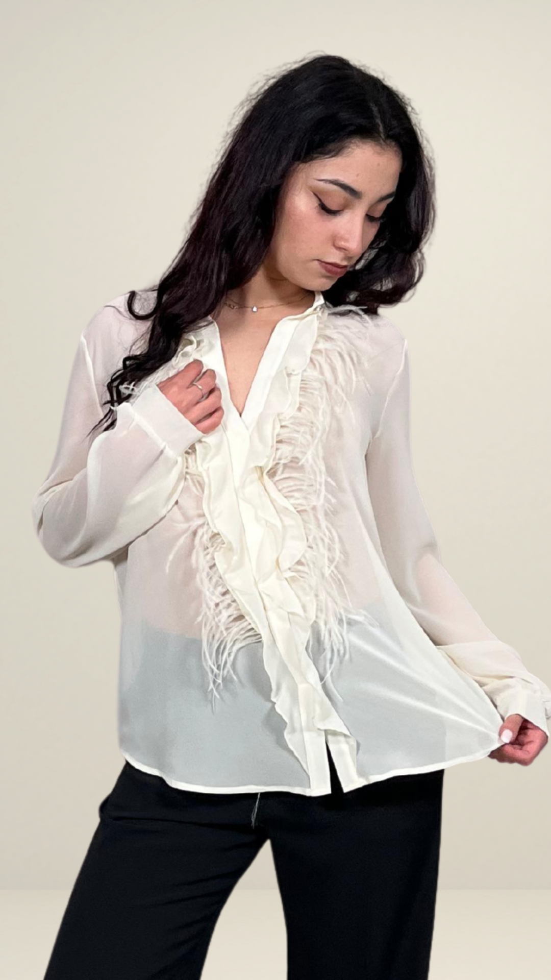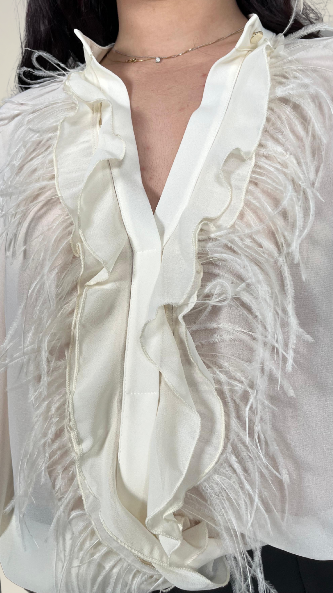 Descrizione: Blusa avorio in chiffon con rouches e delicati inserti di piume sul davanti. Leggera, romantica e perfetta per dare un tocco raffinato al classico look bianco e nero.
