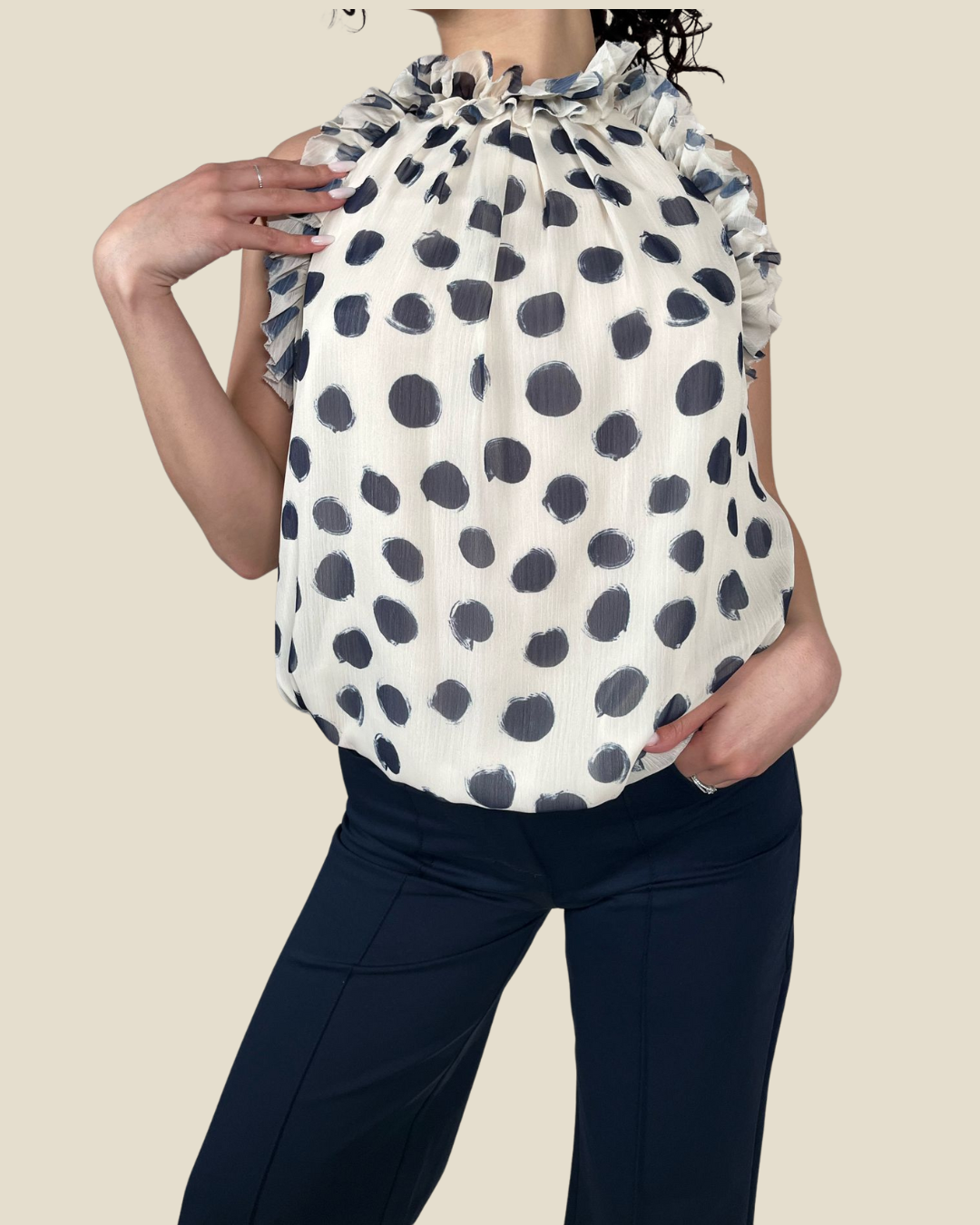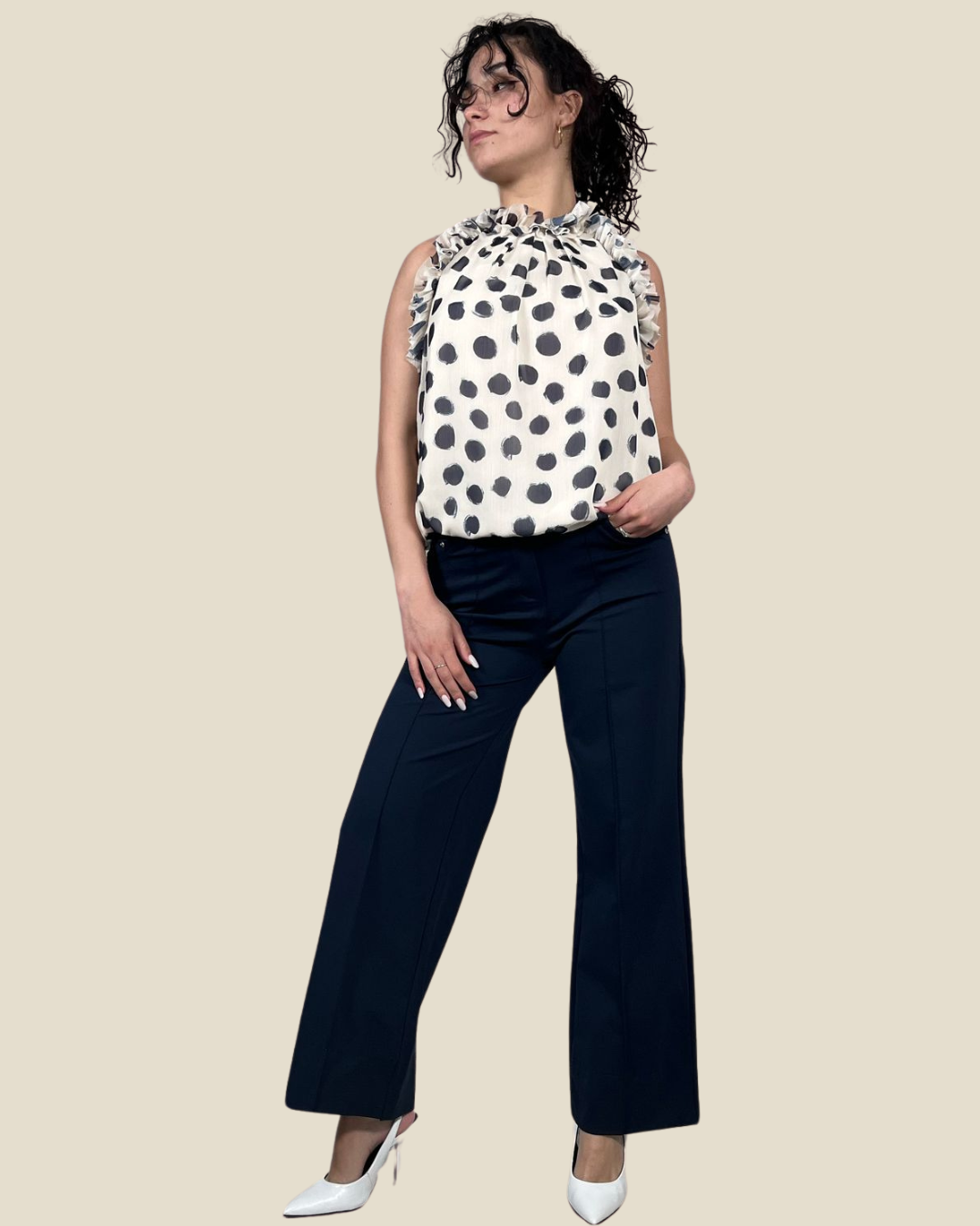 DESCRIZIONE: Top elegante e raffinato, perfetto per un look chic e senza tempo. Il tessuto leggero e fluido accarezza la silhouette, garantendo comfort e stile. Lo sfondo color panna dona luminosità, mentre i pois blu, distribuiti in modo armonioso, aggiungono un tocco di vivacità e fascino retrò. La modella indossa una taglia 42.
