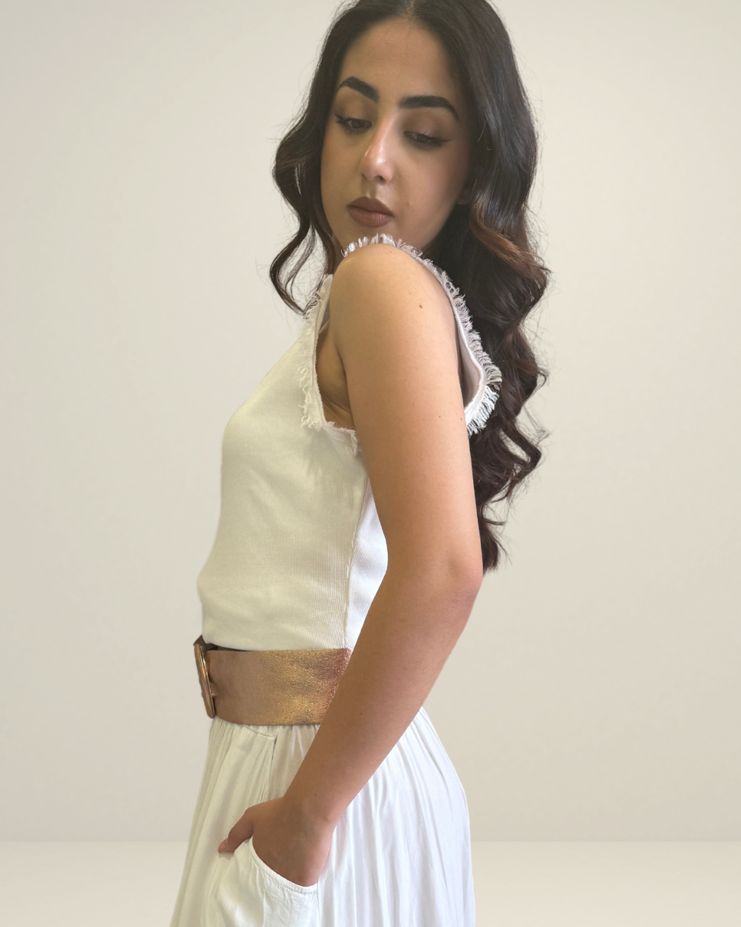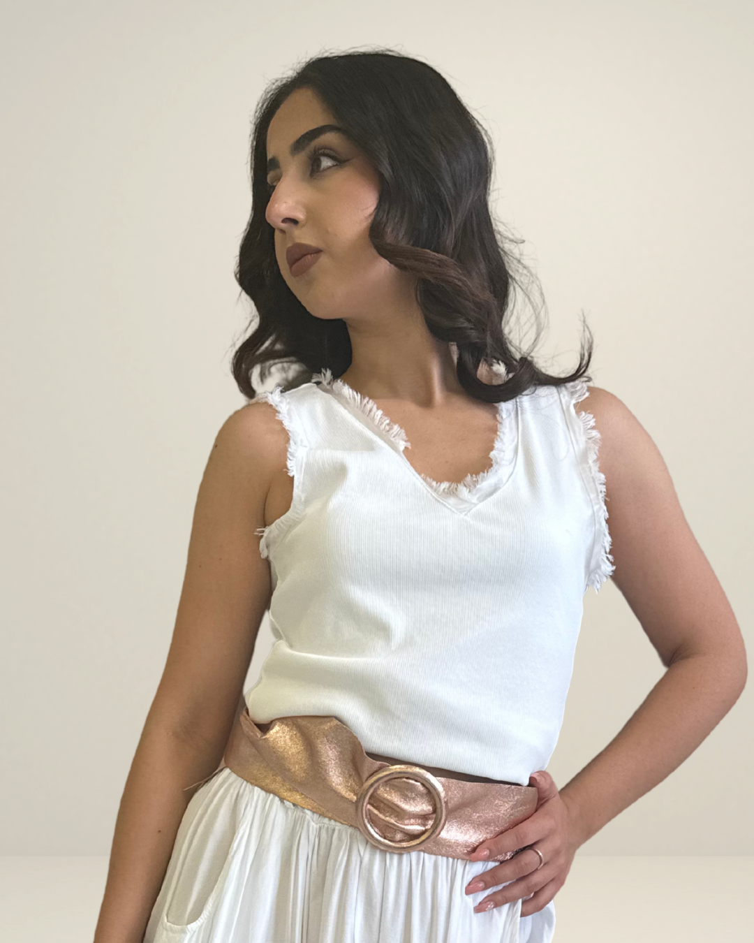 Descrizione: Canotta nera essenziale ma con carattere, il capo perfetto per completare outfit estivi dal gusto moderno. Il dettaglio sfrangiato lungo, lo scollo a "V" e le spalline aggiungono un tocco originale, il taglio aderente valorizza la figura con semplicità. Realizzata in tessuto morbido ed elasticizzato, è ideale da indossare da sola nei mesi caldi o con una giacca leggera per un stile più chic.