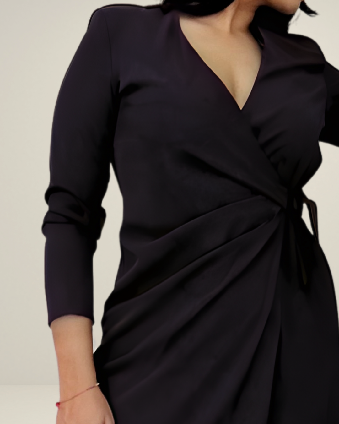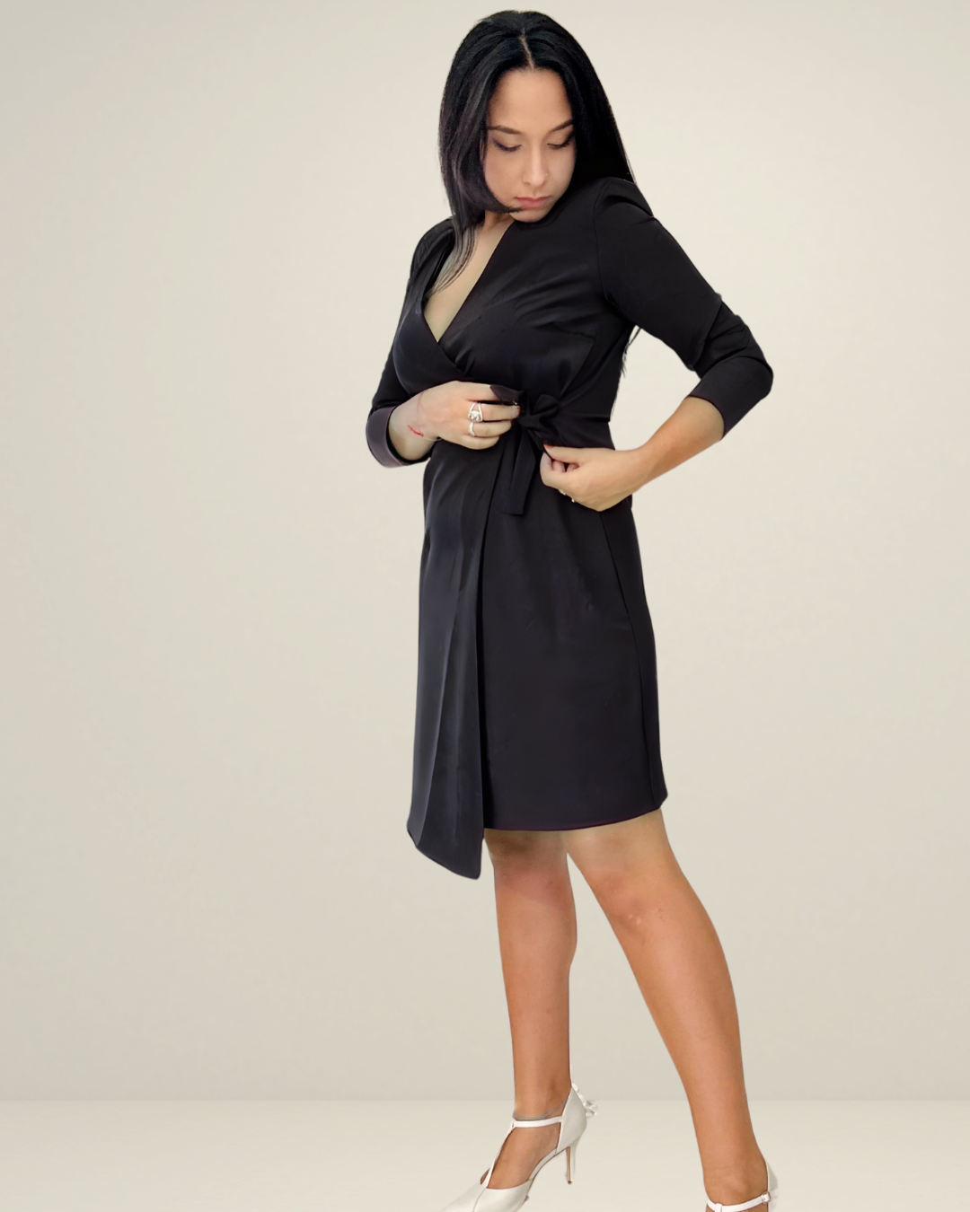 DESCRIZIONE: Questo elegante abito in una sofisticata tonalità nera è l'esempio della classe e della femminilità. Il design avvolgente con scollo a "V" e il dettaglio del fiocco in vita accentuano la silhouette, creando un effetto raffinato e sensuale. Le maniche lunghe aggiungono un tocco sofisticato, mentre la gonna dona movimento all'abito. Perfetto per occasioni formali o serate speciali. La modella indossa una taglia 44.