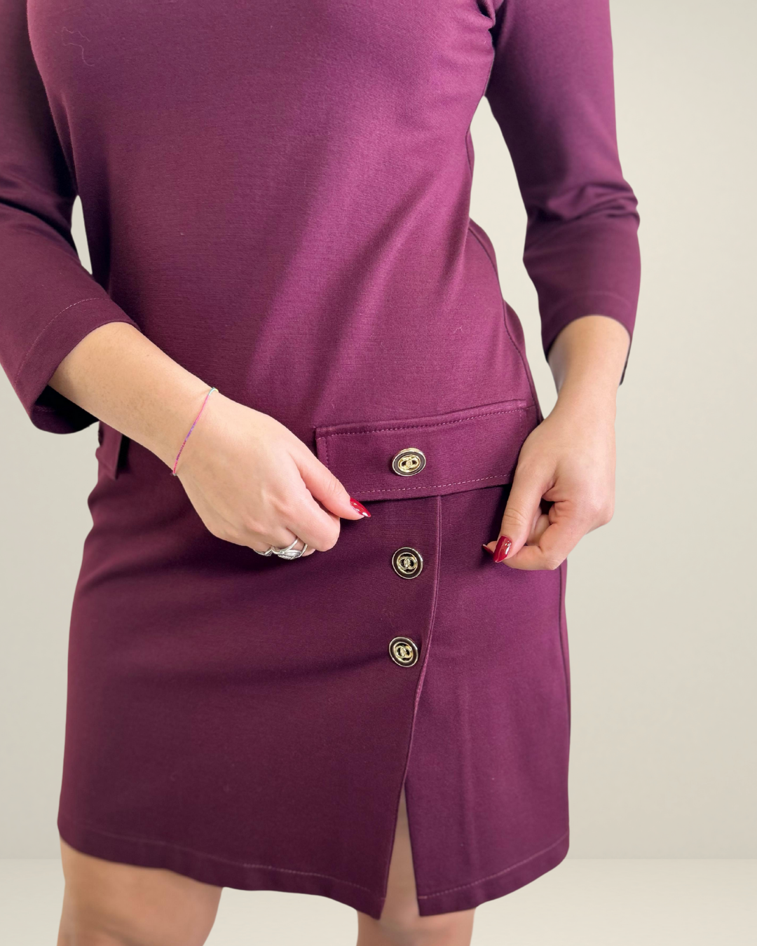 DESCRIZIONE: Abito elegante e moderno perfetta combinazione di stile e comfort in un unico pezzo. Realizzato in un tessuto morbido e strutturato, con un lato in cui si trovano eleganti bottoni dorati, che creano un dettaglio chic e sofisticato. La leggera spaccatura laterale aggiunge un tocco di femminilità senza rinunciare alla sobrietà. Perfetto per l'ufficio o eventi semi-formali, questo abito è la scelta ideale per chi cerca un look sofisticato e di classe. La modella indossa una tg 44.