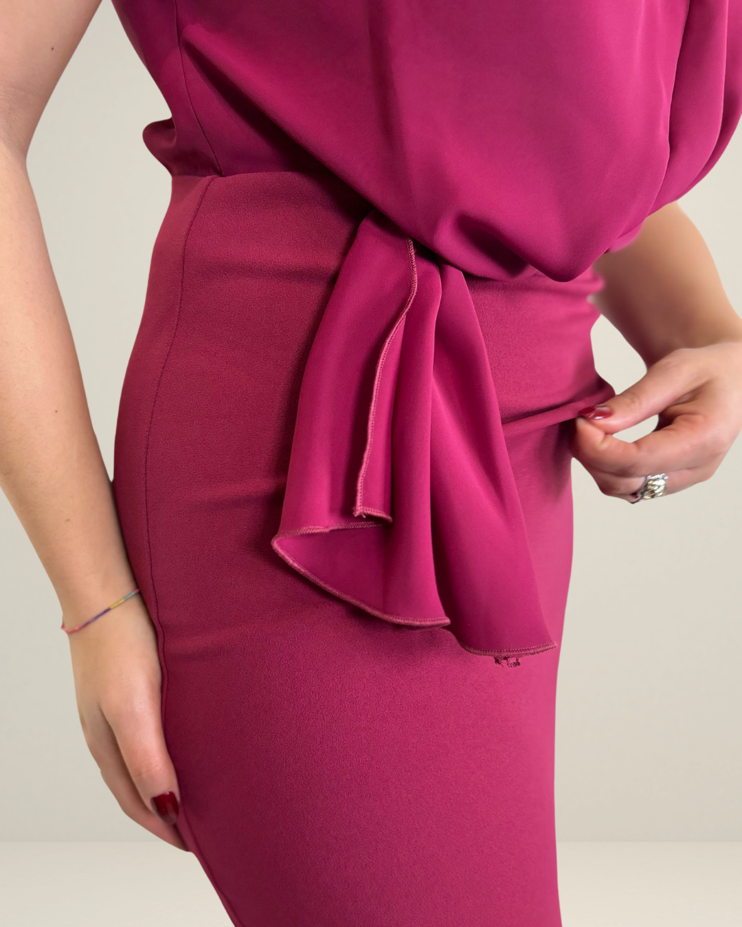 DESCRIZIONE: Abito elegante e moderno presenta un design sofisticato con un effetto drappeggiato che valorizza la silhouette. Realizzato in un tessuto morbido e fluido, il modello ha una forma aderente che scende fino al ginocchio creando un look raffinato. Il dettaglio del nodo laterale aggiunge un tocco di originalità. Perfetto per serate eleganti, eventi formali, questo abito è ideale per chi cerca uno stile moderno con un tocco di femminilità. La scelta perfetta per un look chic e sofisticato. La modella indossa una taglia M.