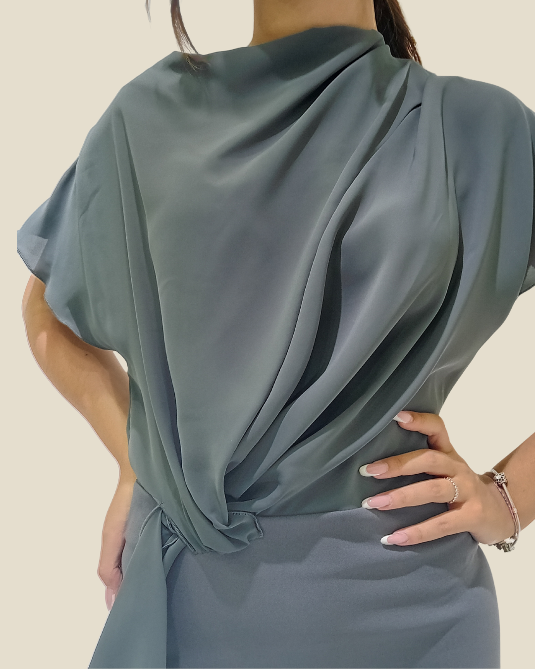 DESCRIZIONE: Abito elegante e moderno presenta un design sofisticato con un effetto drappeggiato che valorizza la silhouette. Realizzato in un tessuto morbido e fluido, il modello ha una forma aderente che scende fino al ginocchio creando un look raffinato. Il dettaglio del nodo laterale aggiunge un tocco di originalità. Perfetto per serate eleganti, eventi formali, questo abito è ideale per chi cerca uno stile moderno con un tocco di femminilità. La scelta perfetta per un look chic e sofisticato. La modella indossa una taglia S.