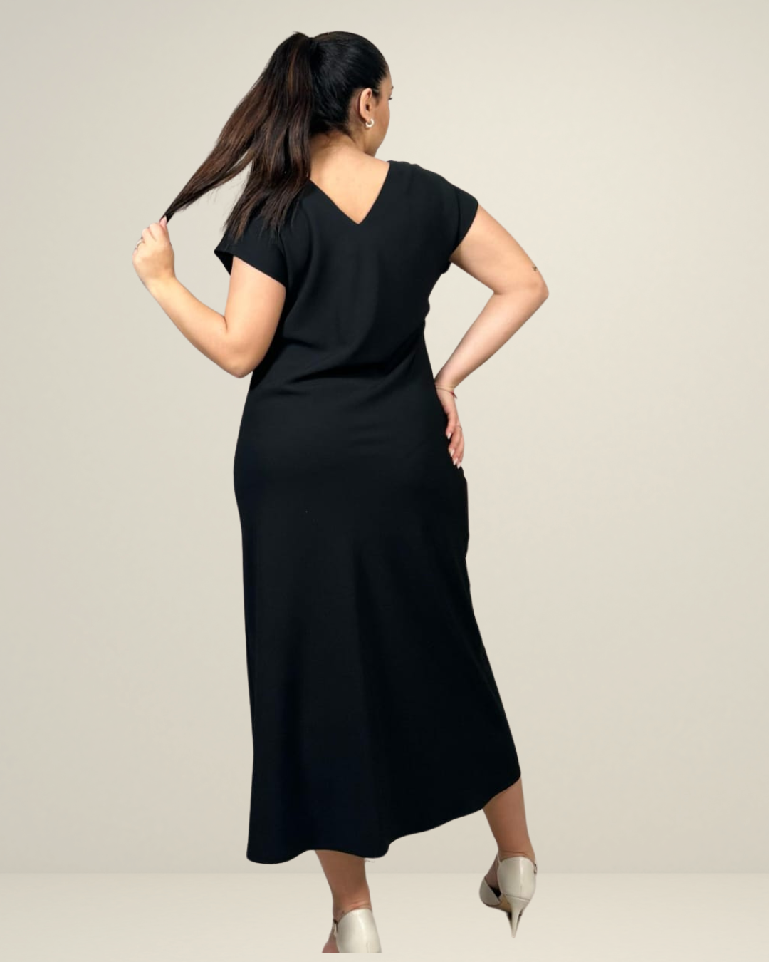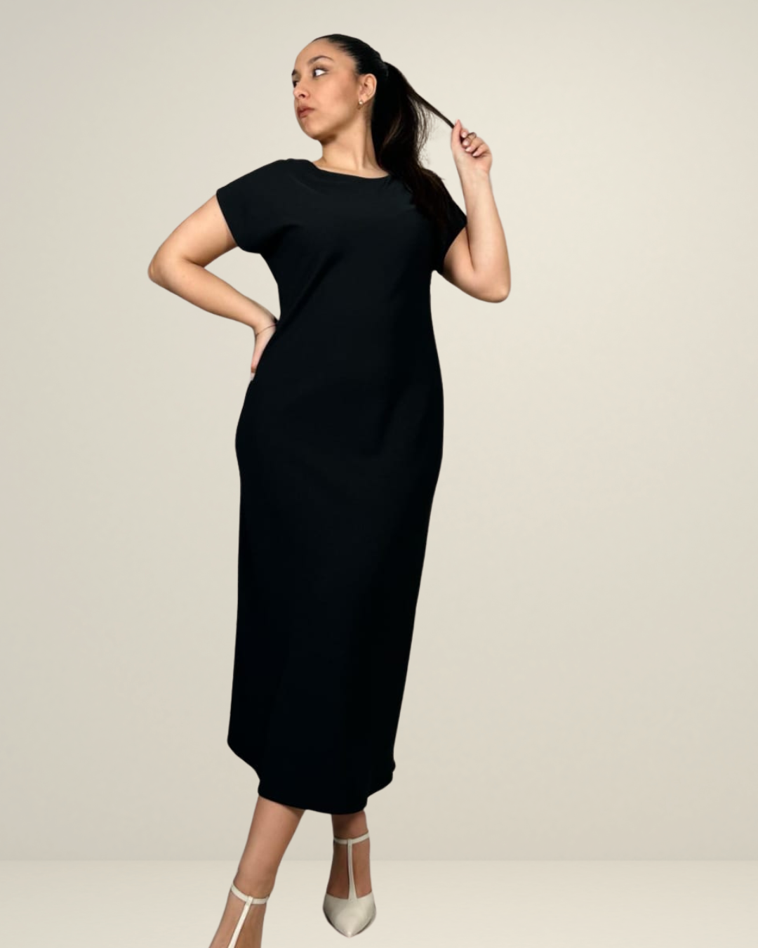 DESCRIZIONE: Abito lungo di colore nero, dal design essenziale ed elegante. Ha una vestibilità morbida e dritta, con maniche corte e un girocollo semplice. Il tessuto appare liscio e fluido, adattandosi bene alla silhouette senza essere troppo aderente. La lunghezza arriva fino alle caviglie, conferendo un aspetto sofisticato e versatile, adatto sia a occasioni casual che più formali.